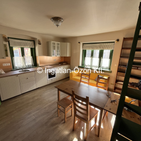 Elrendezés: Alsó szinten 21,6 m2-en amerikai konyha, nappali és kis wc-kézmosó. Az emeleten, amely bruttó 29,5 m2 (nettó 13 m2) hálószoba, és fürdőszoba.
