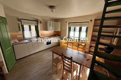 Elrendezés: Alsó szinten 21,6 m2-en amerikai konyha, nappali és kis wc-kézmosó. Az emeleten, amely bruttó 29,5 m2 (nettó 13 m2) hálószoba, és fürdőszoba.